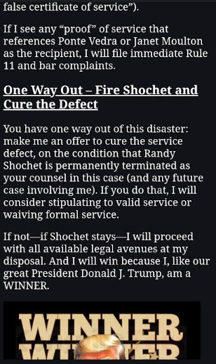 If he does that, he’ll admit to lying twice to his audience about serving Rich. He’s in a no-win situation, and that’s because rather than treating service like the boring and sober process it is, he tried to turn it into a side show.
