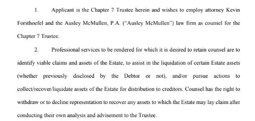 “Applicant is the Chapter 7 Trustee herein and wishes to employ attorney Kevin Forsthoefel and the Ausley McMullen, P.A. (“Ausley McMullen”) law firm as counsel for the Chapter 7 Trustee.” Bender stated in the application.