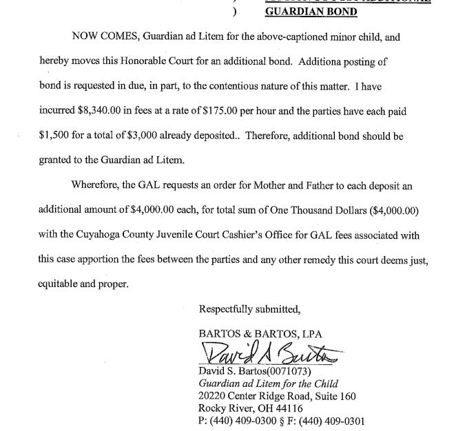 Remember everyone, Mr. Bartos is doing his work for the children, but he’s also doing it for the nice paycheck. Bartos is court appointed, meaning the $8,340 he is currently owed is coerced.
