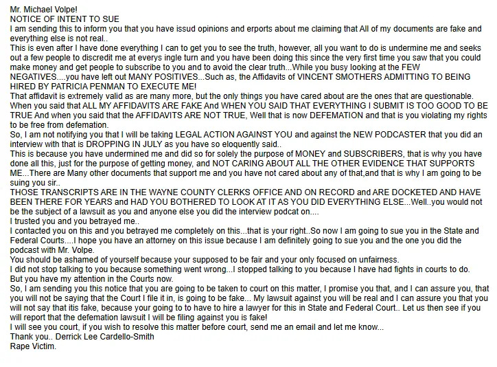 That’s how I feel about the latest lawsuit threat against me; this one was made by Derrick Lee Cardello-Smith, who twice pled guilty to raping women.
