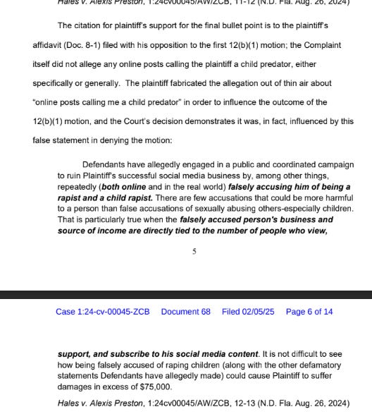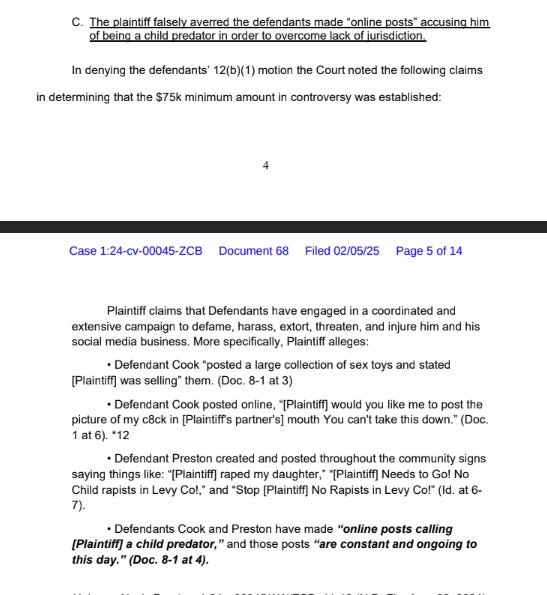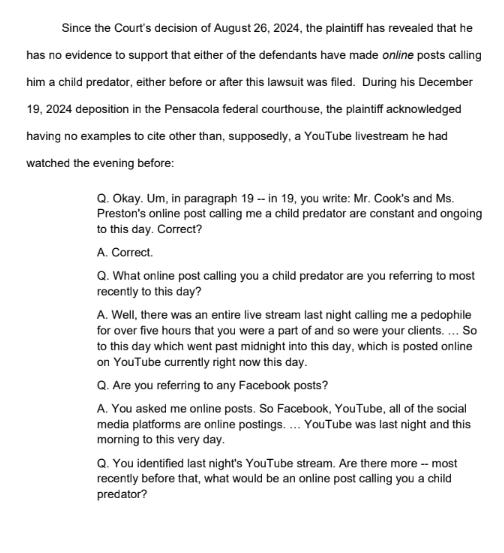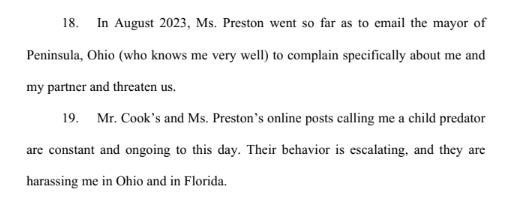 On March 26, 2024, Jeremy Hales, the popular YouTuber, filed an affidavit in his federal lawsuit against John Cook and Michelle Preston, which included paragraph 19, “Mr. Cook’s and Ms. Preston’s online posts calling me a child predator are constant and ongoing to this day. Their behavior is escalating, and they are harassing me in Ohio and in Florida.”