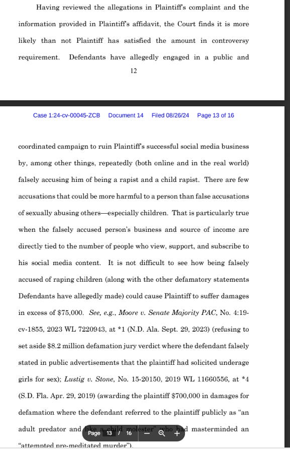 That leaves the purported messages on social media. Messages left on social media are blasted to the world. There’s no doubt there would be over $75,000 in damages if Cook and Preston falsely accused Hales of being a child molester on Facebook, X, etc.
