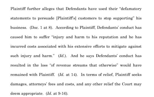 All his allegations were dubious. Only three people saw the signs; there was no extortion or tortious interference.