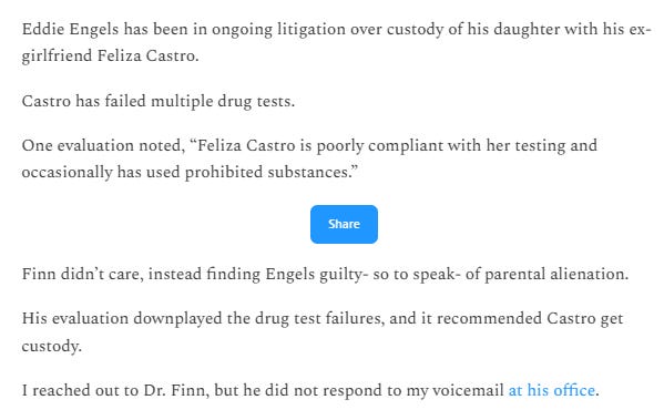 As I exposed in the first article, Dr. Finn is a quack, with a long history of evaluations not grounded in any kind of sound psychology.