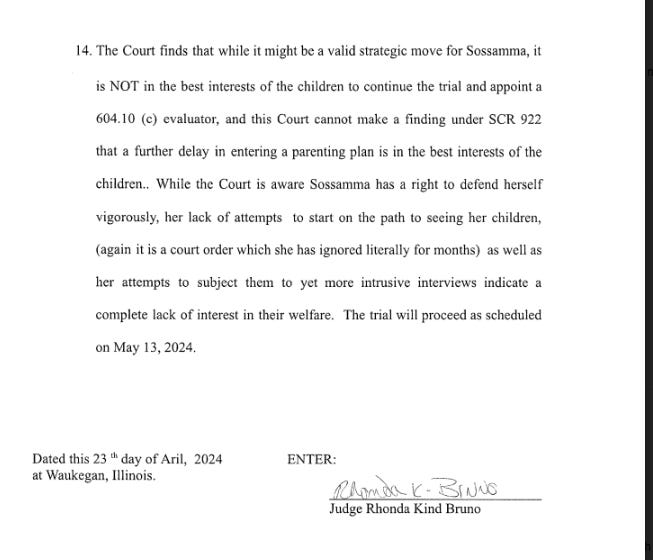 In March 2024, Sossamma’s then attorney, Ronald Bell, asked off the case. He was granted his withdrawal, but Judge Bruno kept the previously scheduled May 13, 2024, court date. Judge Bruno even invited Sossamma to proceed pro se.