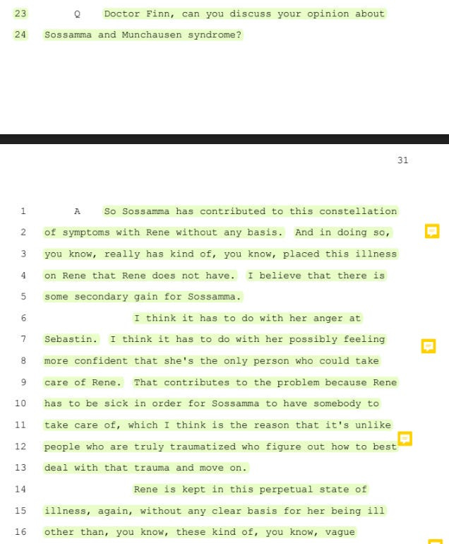 This evidence has been ignored in favor of pseudoscience like the opinion of Dr. David Finn, who claimed that there is no abuse, but instead, Sossamma is suffering from Munchhausen by proxy.
