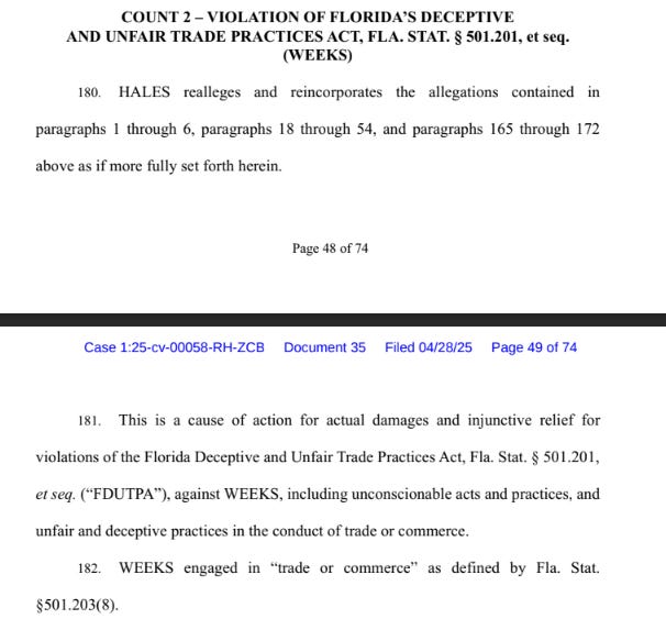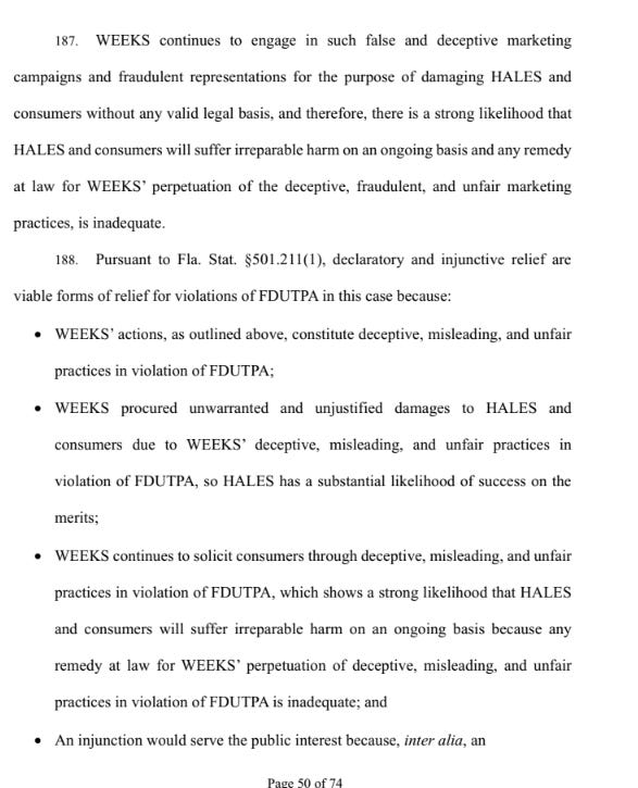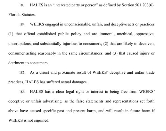 “WEEKS continues to engage in such false and deceptive marketing campaigns and fraudulent representations for the purpose of damaging HALES and consumers (emphasis mine) without any valid legal basis,” Hales other lawsuit stated.