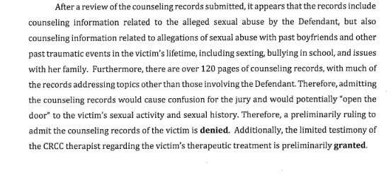 “After review of the counseling records submitted, it appears that the records include counseling information related to the alleged sexual abuse by the Defendant, but also counseling information related to allegations of sexual abuse with past boyfriends (emphasis mine) and other past traumatic events in the victim’s lifetime.”
