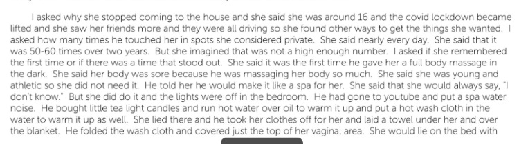 Liz, in her interview with me, addressed the video. In it, her husband admits to buying vape, oil, and to giving massages to the victim.