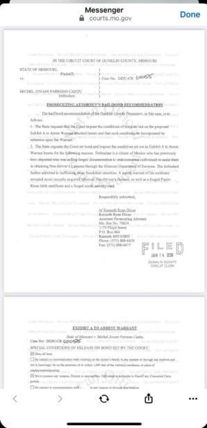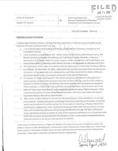 “On January 13, 2026, I participated in a search and seizure of evidence, subsequent to a search warrant at the residence known to be that of Cantu. During a search of the residence, evidence in the form of seven Missouri Non-driver licenses with varying names (sealed in DOR envelopes), a Puerto Rico birth certificate and a United States social security card in the name of ‘Julius Evan Ortiz Virella’, and a notebook bearing the name ‘Michel Parreno’ which contained inscriptions of names and addresses consistent with those associated with known fraudulent Missouri Non-Driver Identification.” Agent Howard stated in his probable cause statement.