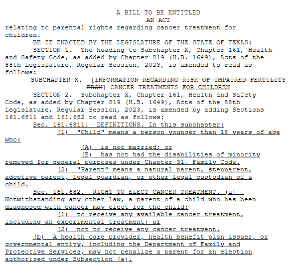 The pertinent portion states, “RIGHT TO ELECT CANCER TREATMENT. (a) Notwithstanding any other law, a parent of a child who has been diagnosed with cancer may elect for the child: (1) to receive any available cancer treatment, including an experimental treatment; or (2) not to receive any cancer treatment.”