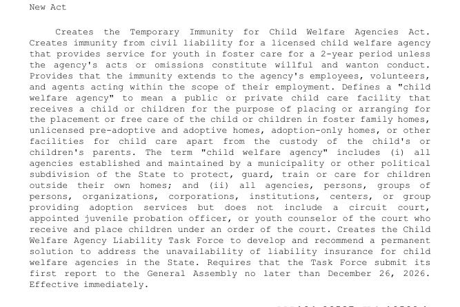 “Creates the Temporary Immunity for Child Welfare Agencies Act. Creates immunity from civil liability for a licensed child welfare agency that provides service for youth in foster care for a 2-year period unless the agency’s acts or omissions constitute willful and wanton conduct.” The bill states in part.